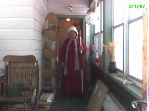 Elleni came to the front door just as I was about to go out and rescue her. I had my rake in hand and my new slippers on!