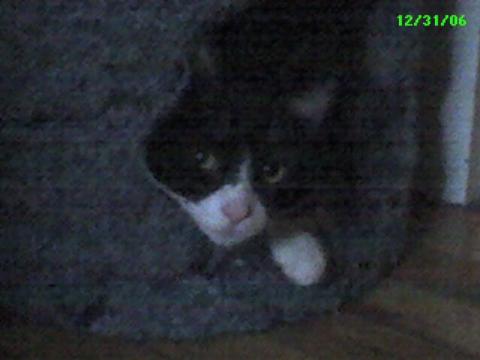 Kitty cuddles up in the cat house.