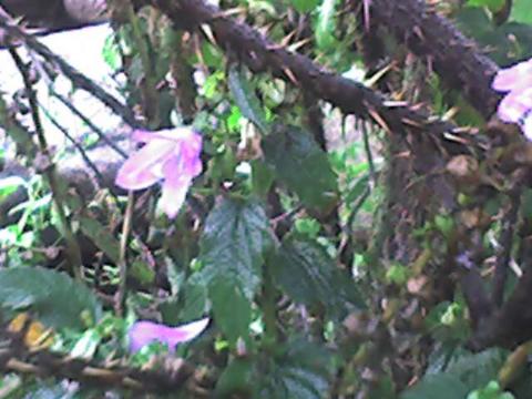 Maybe a weed. Growing in thorny rose bush. At bus stop.