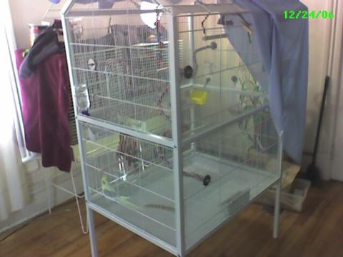 After 30 minutes of coaxing, Freddie moved into their new cage in a flurry. Here, Freddie nervously checks out his new surroundings as Maggie looks on from her studio apartment. Maggie may move in tonight or tomorrow.
