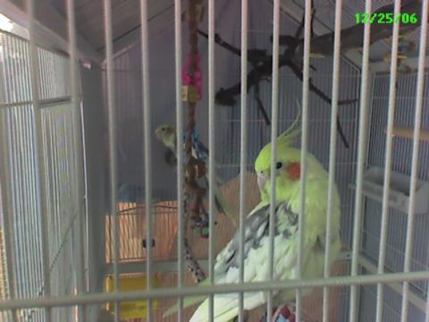 Maggie "flew" up to the middle of the cage, but could not figure out how to get over the large divider bar. After crawling completly around the cage, she settled on the opposite end from Freddie.